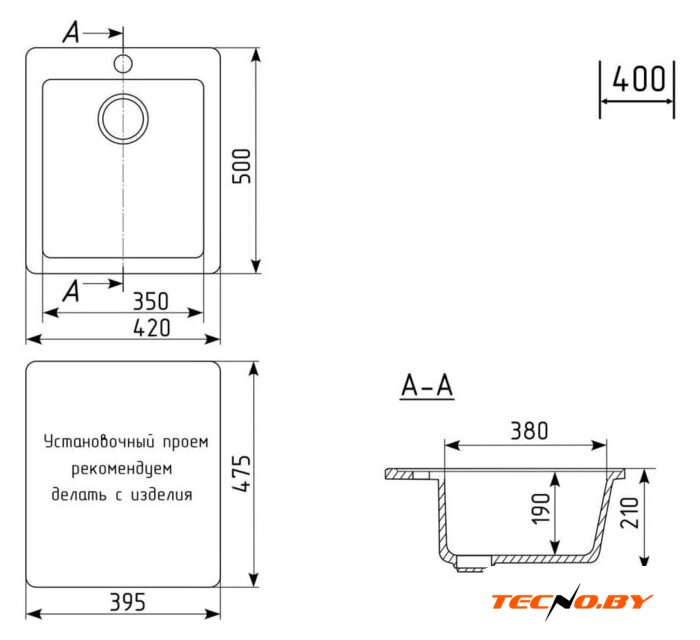 врезная на столешницу, искусственный камень, размеры: 42x49 см, глубина чаши: 19 см, в шкаф шириной от 40 см
