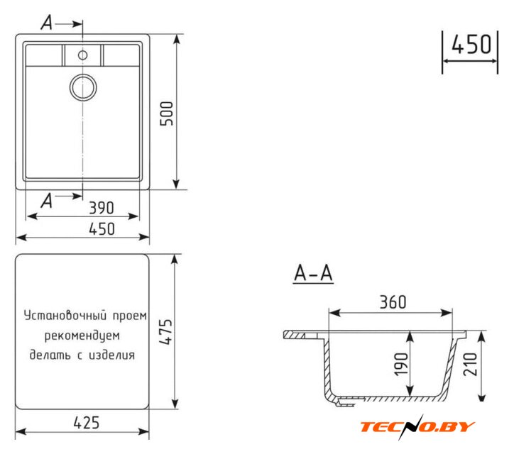 врезная на столешницу, искусственный камень, размеры: 45x50 см, глубина чаши: 18 см