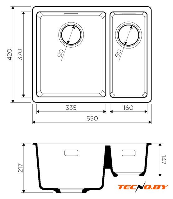 врезная под столешницу, искусственный камень, размеры: 55x42 см, в шкаф 60 см
