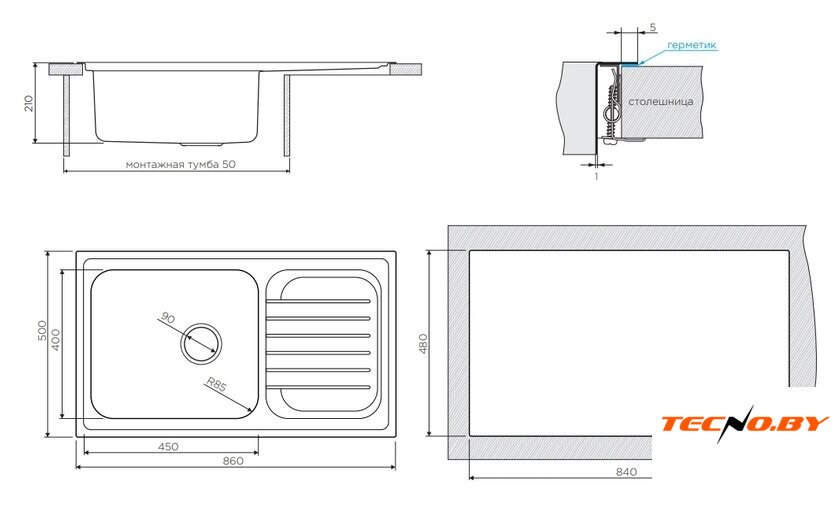 врезная на столешницу, искусственный камень, размеры: 86x50 см, глубина чаши: 24 см, в шкаф шириной от 50 см, клапан-автомат