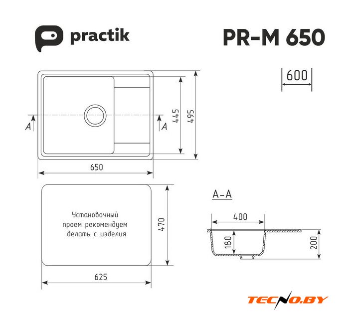 врезная на столешницу, искусственный камень, размеры: 49.5x65 см, в шкаф 60 см