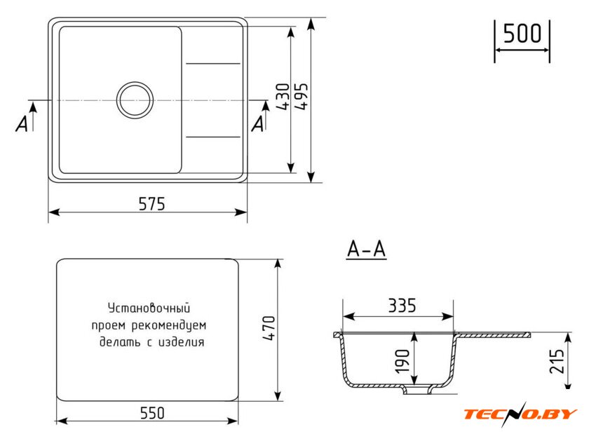 врезная на столешницу, искусственный камень, размеры: 49.5x57.5 см, в шкаф 50 см