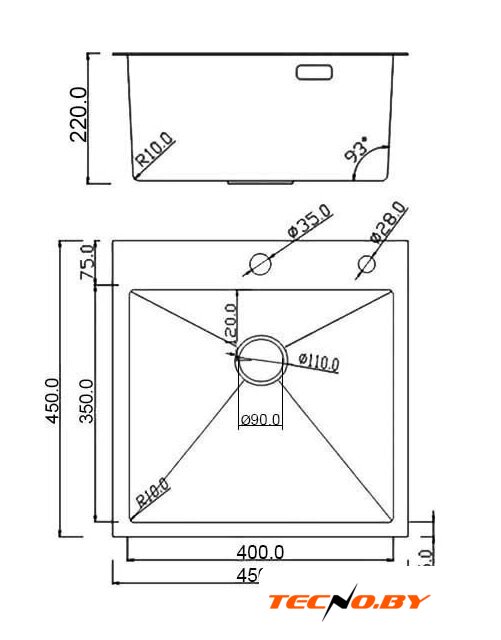врезная под столешницу, искусственный камень, размеры: 43.5x45.5 см, глубина чаши: 18.5 см, в шкаф шириной от 50 см