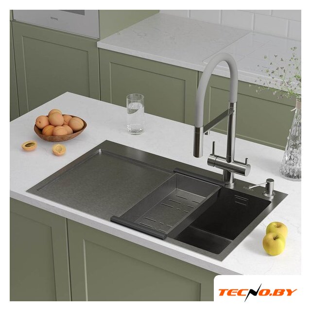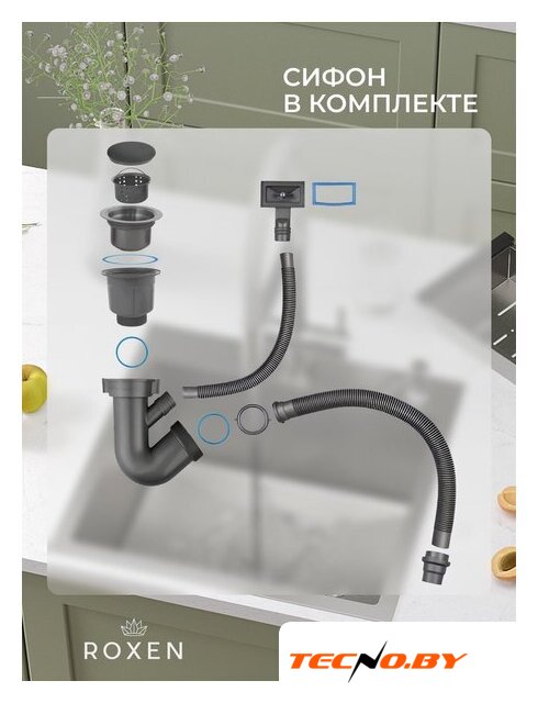 Комплектация | сифон с гофрой, коландер из нержавеющей стали, дозатор для моющих средств, корзинчатый вентиль, 2 заглушки на отверстия, комплект креплений к столешнице |