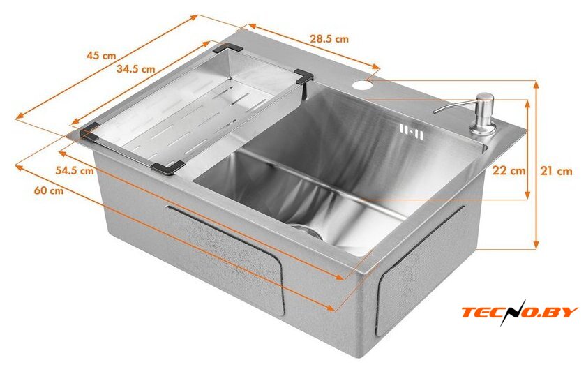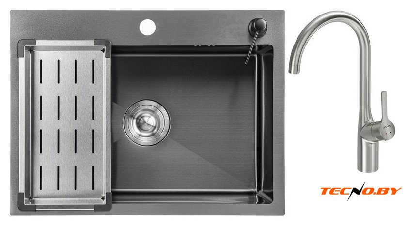 Комплектация | Мойка кухонная Saniteco 6045 Nano (с сифоном, дозатором и коландером); Смеситель AM.PM Spike F9S07011 (сатин) |