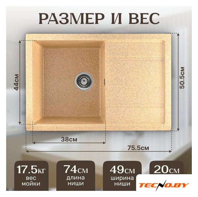 врезная на столешницу, искусственный камень, размеры: 50x59 см, глубина чаши: 19 см, в шкаф шириной от 60 см