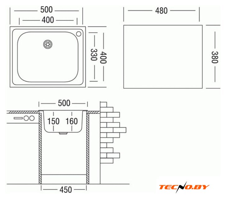 накладная, нержавеющая сталь, размеры: 50x50 см, глубина чаши: 14 см