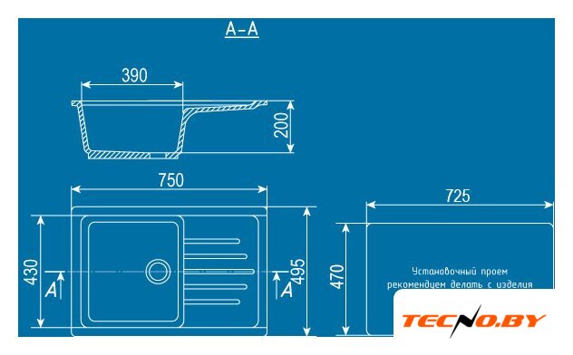 врезная на столешницу, искусственный камень, размеры: 75x49.5 см, в шкаф 60 см