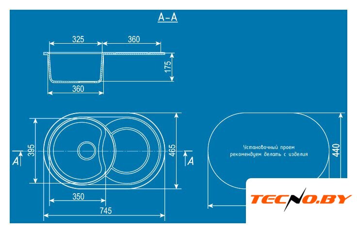 врезная на столешницу, искусственный камень, размеры: 74.5x46.5 см, в шкаф 50 см