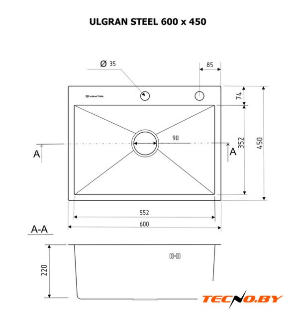 врезная на столешницу/врезная под столешницу, искусственный камень, размеры: 55x46 см, глубина чаши: 20 см, в шкаф шириной от 60 см