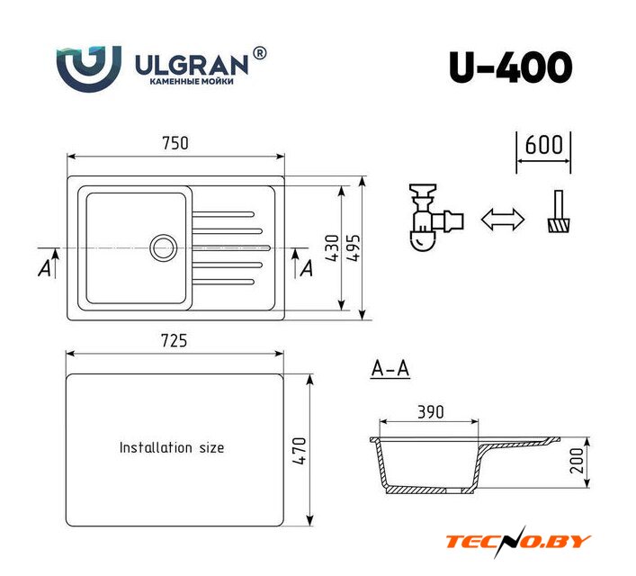 врезная на столешницу, искусственный камень, размеры: 75x49.5 см, в шкаф 60 см