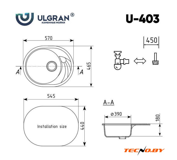 врезная на столешницу, искусственный камень, размеры: 57x46.5 см, в шкаф 45 см
