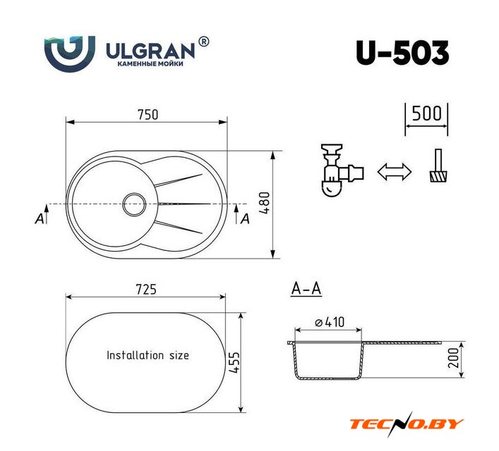 врезная на столешницу, искусственный камень, размеры: 74.5x46.5 см, в шкаф 50 см