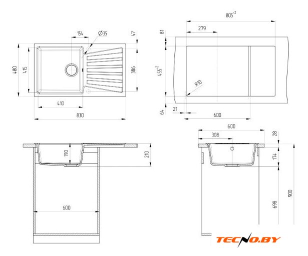 врезная на столешницу, искусственный камень, размеры: 48x83 см, в шкаф 60 см