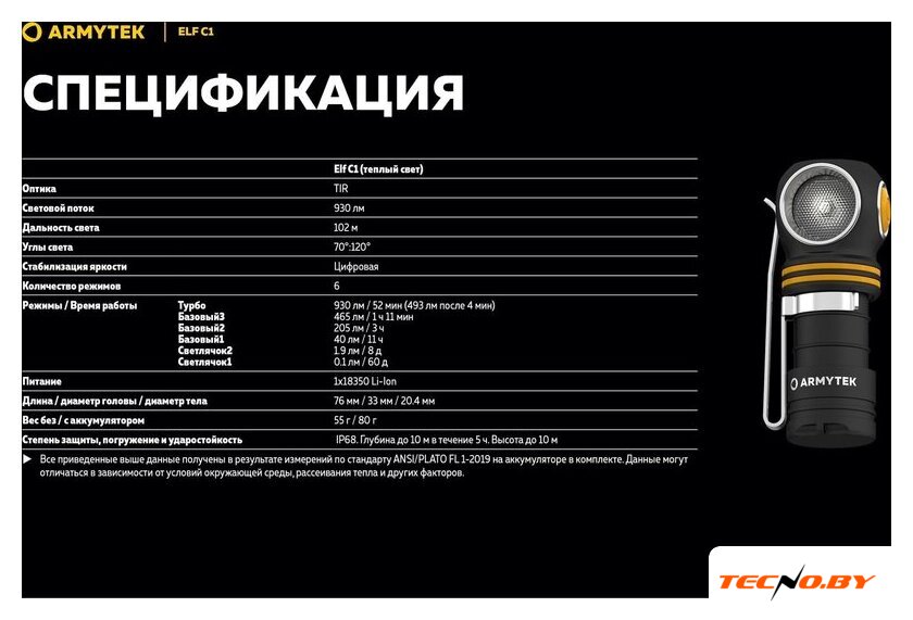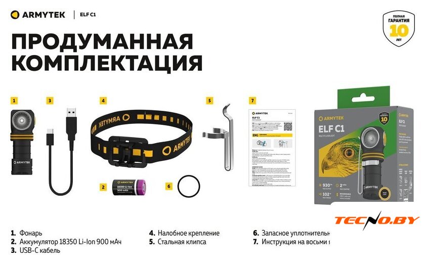 | Комплект поставки | - Фонарь;- Аккумулятор 18350 Li-Ion 900 мАч;- USB-C кабель;- Налобное крепление;- Клипса;- Запасное уплотнительное кольцо;- Инструкция. |
