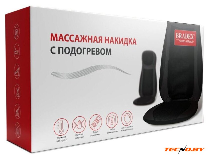 автоматический режим управления, материал: искусственная кожа, роликовый массаж, точечный массаж, подогрев, питание: сеть 220В/прикуриватель, размеры: 48x16x40 см