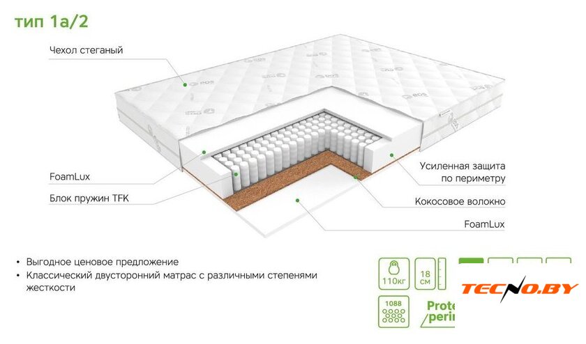 независимые пружины, TFK, 272 шт/м², кокосовая койра/пенополиуретан, жесткость: среднемягкий/средний, 110 кг/место, высота: 18 см, чехол: трикотажная ткань PREMIUM