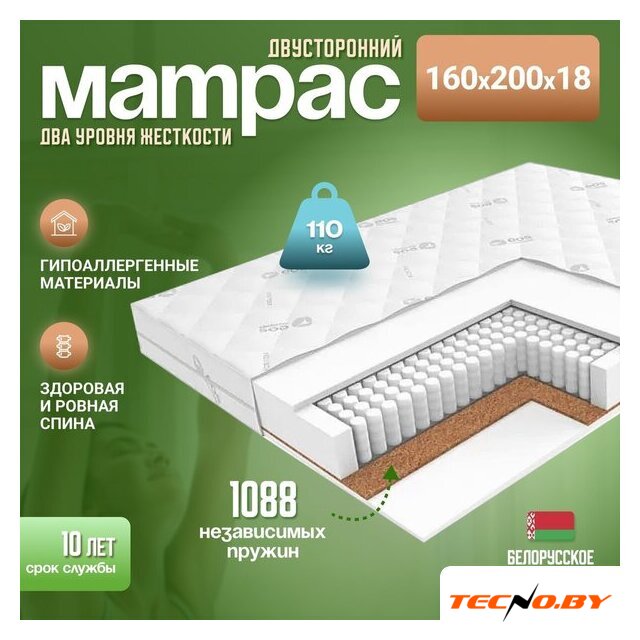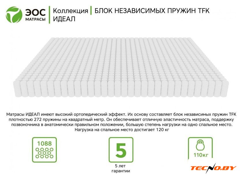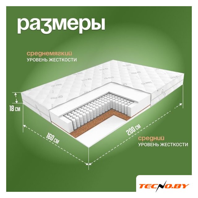 независимые пружины, TFK, 272 шт/м², кокосовая койра/пенополиуретан, жесткость: среднемягкий/средний, 110 кг/место, высота: 18 см, чехол: трикотажная ткань PREMIUM