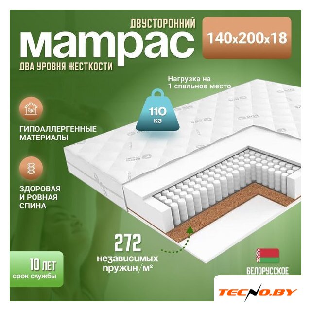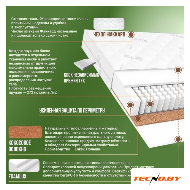 независимые пружины, TFK, 272 шт/м², кокосовая койра/пенополиуретан, жесткость: среднемягкий/средний, 110 кг/место, высота: 18 см, чехол: трикотажная ткань PREMIUM