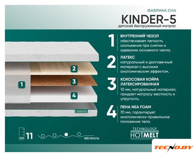 детский, беспружинный, пенополиуретан, 1 зона, жесткость: средний/среднежёсткий, 80 кг/место, высота: 11 см, чехол: трикотаж
