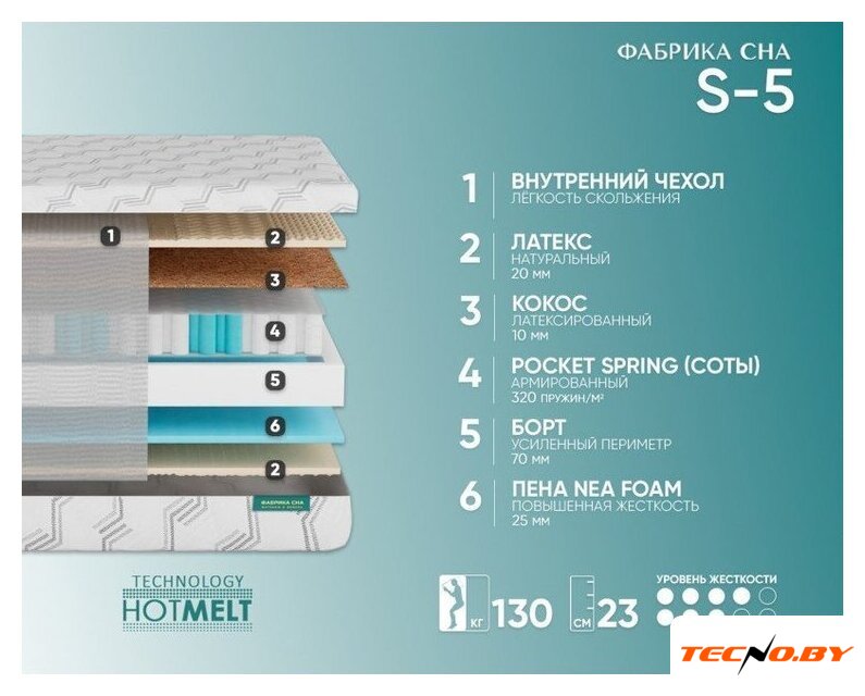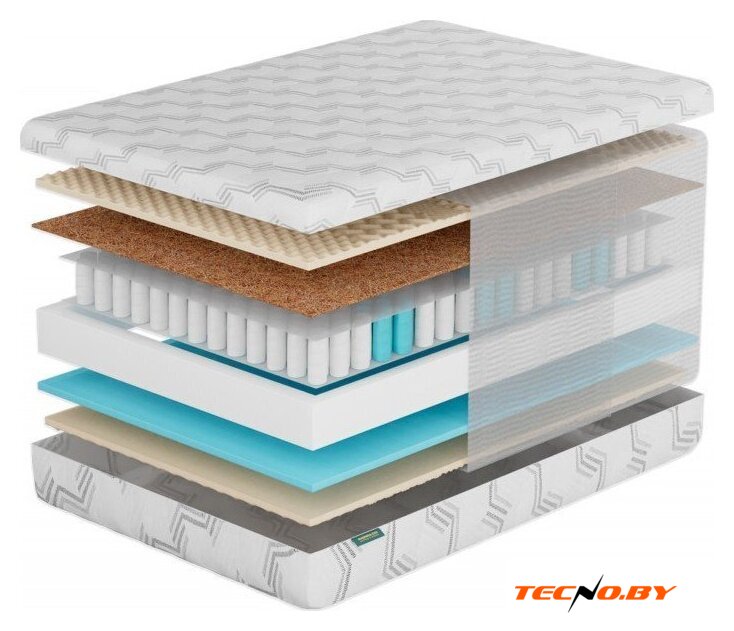 независимые пружины, Hourglass ("песочные часы"), 256 шт/м², кокосовая койра/латекс/пенополиуретан, 9 зон, жесткость: средний/среднежёсткий, 140 кг/место, высота: 24 см, чехол: трикотаж