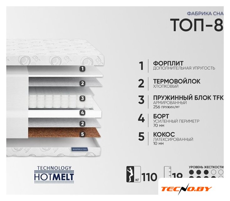 независимые пружины, TFK, 256 шт/м², 1 зона, жесткость: среднемягкий/средний, 110 кг/место, высота: 18 см, чехол: джерси