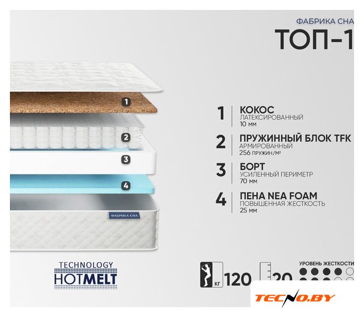 независимые пружины, TFK, 272 шт/м², кокосовая койра/пенополиуретан, жесткость: среднемягкий/средний, 110 кг/место, высота: 18 см, чехол: трикотажная ткань PREMIUM