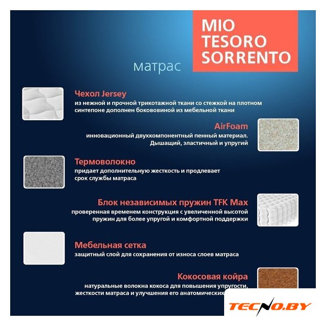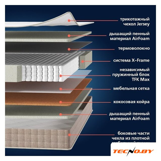 независимые пружины, 256 шт/м², пенополиуретан/кокосовая койра, жесткость: среднемягкий/средний, 100 кг/место, высота: 19 см, чехол: трикотаж