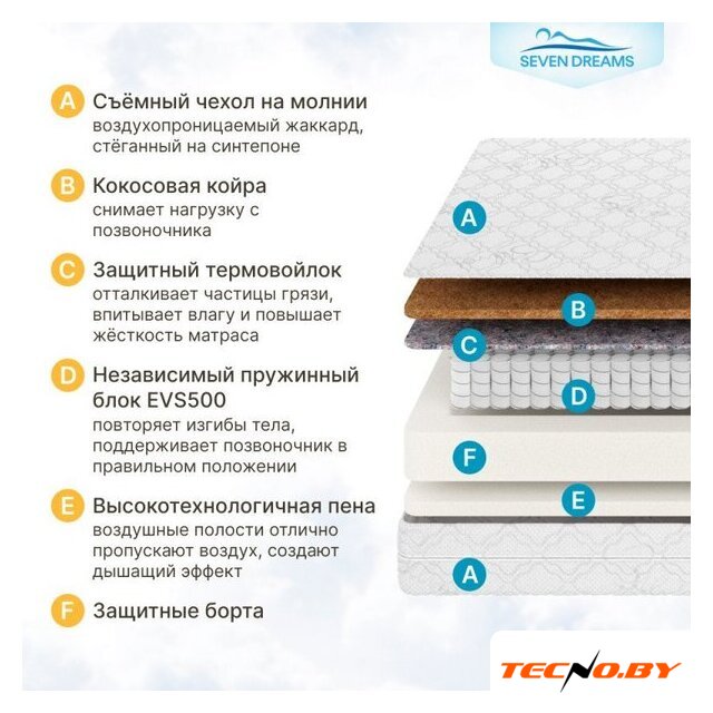 независимые пружины, TFK, 256 шт/м², 7 зон, жесткость: среднежёсткий, 130 кг/место, высота: 22 см, чехол: бамбуковое волокно