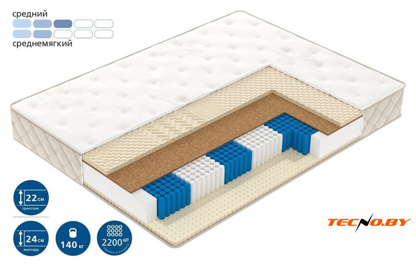 независимые пружины, 7 зон, жесткость: средний/жёсткий, 140 кг/место, высота: 24 см, чехол: трикотаж/велюр