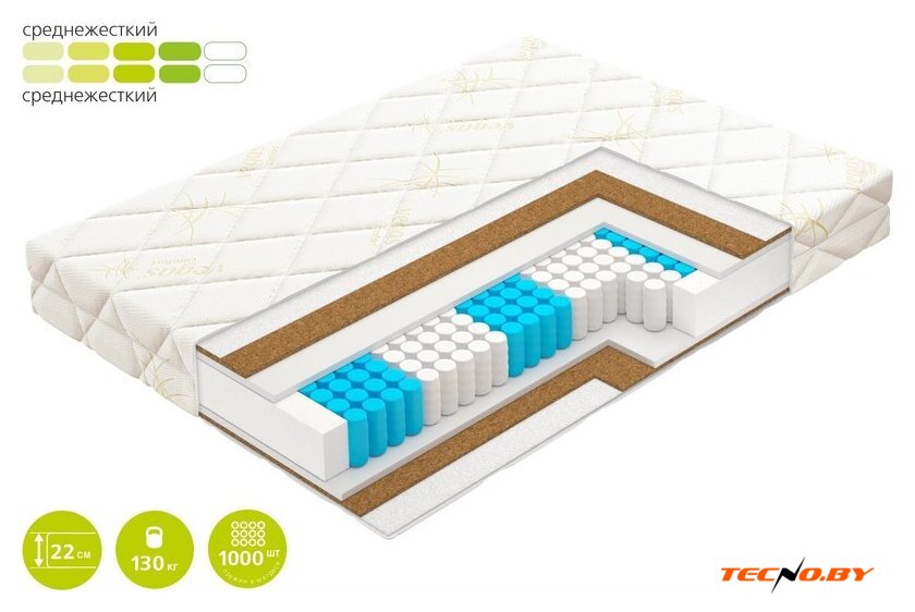 независимые пружины, 270 шт/м², 5 зон, жесткость: среднежёсткий, 140 кг/место, высота: 22 см, чехол: трикотаж с антибактериальной обработкой