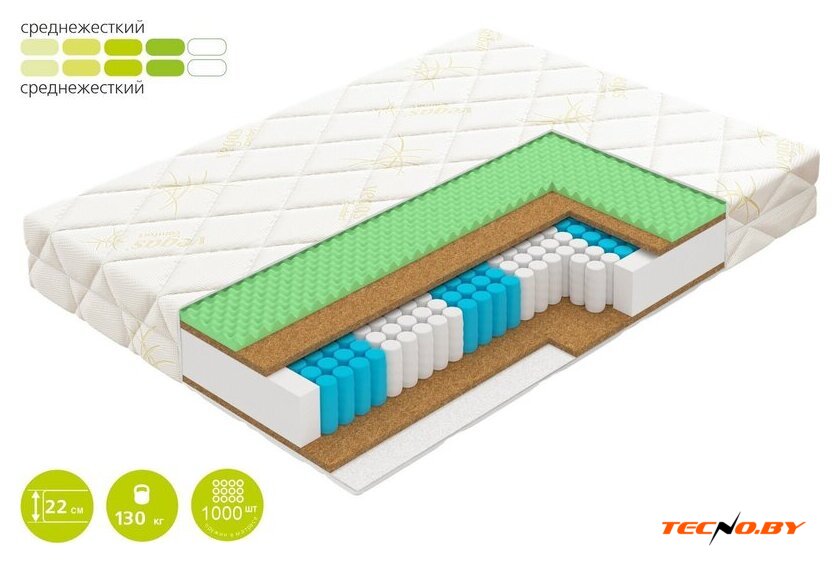 независимые пружины, TFK, 256 шт/м², 7 зон, жесткость: средний/среднежёсткий, 120 кг/место, высота: 21 см, чехол: бамбуковое волокно