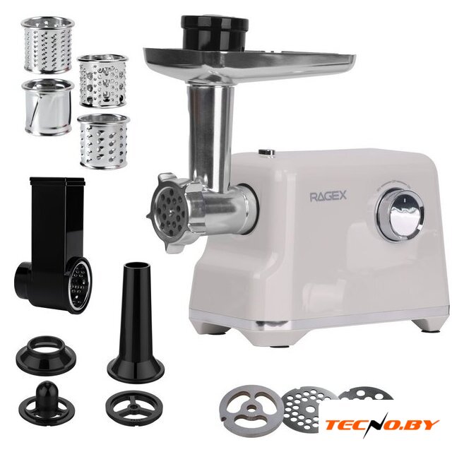 | Полная комплектация | загрузочный лоток, нож, шнек, фиксирующая гайка, толкатель, формовочные диски (3 шт.), насадка для домашней колбасы, насадка для кеббе, терки (2 шт.), насадка для драников |