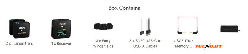 | Комплект поставки | - приемник- два передатчика- съемная ветрозащита- аудиокабель (3.5 мм - 3.5 мм)- три USB-кабеля для зарядки (USB Type-C - USB Type-A)- чехол- документация |