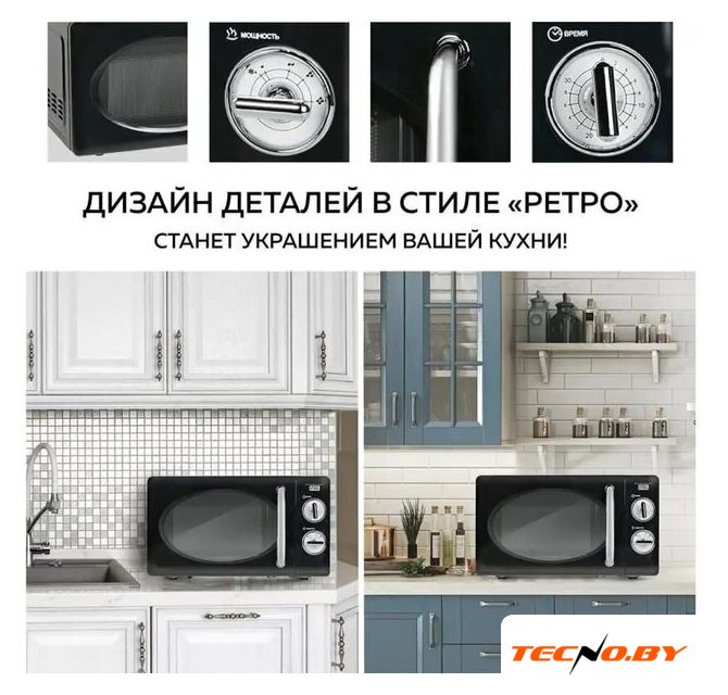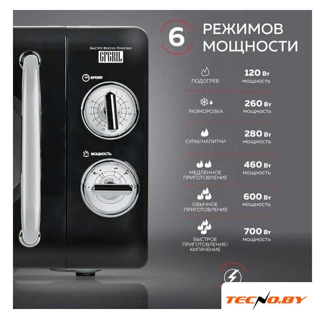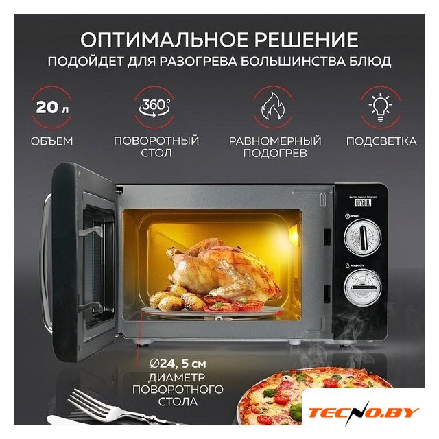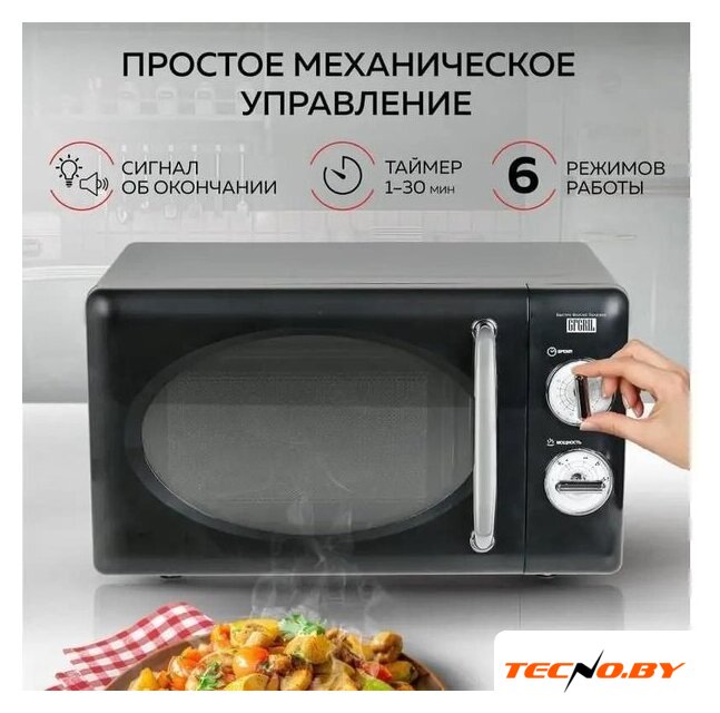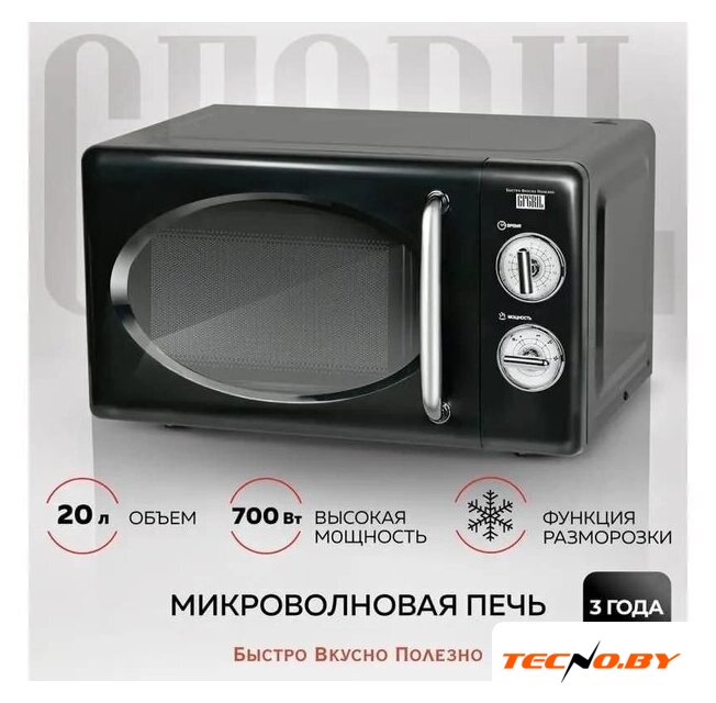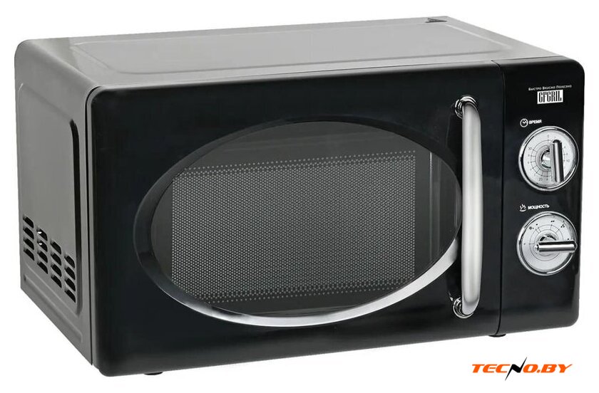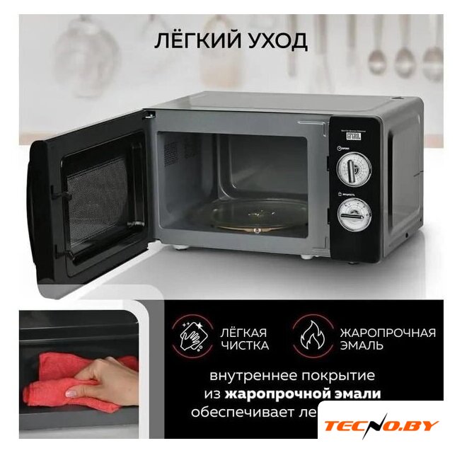 отдельностоящая, микроволны (соло), объем 20 л, выходная мощность микроволн 700 Вт, управление механическое, автоприготовление, авторазмораживание, цвет черный