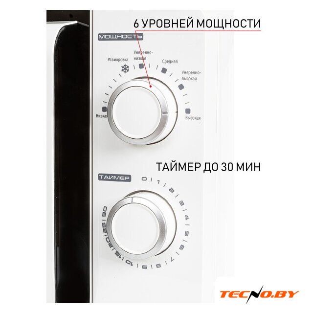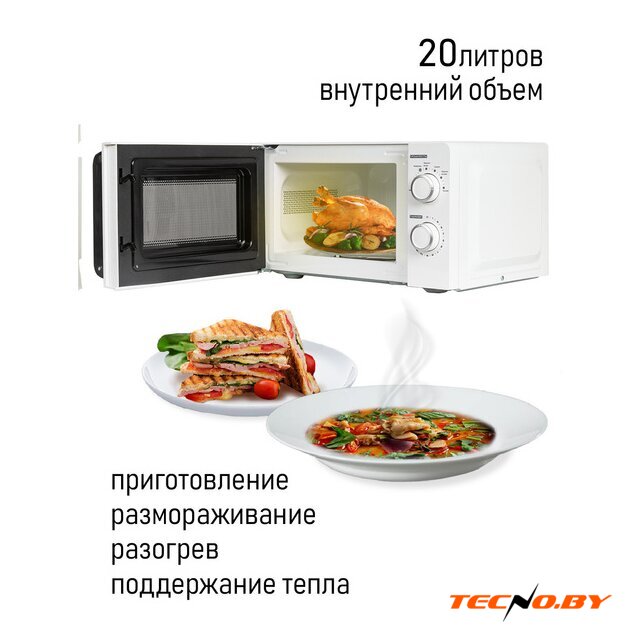 отдельностоящая, микроволны (соло), объем 20 л, выходная мощность микроволн 700 Вт, управление механическое, цвет белый