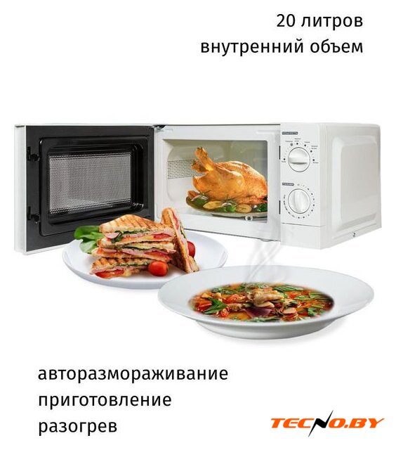 отдельностоящая, микроволны (соло), объем 20 л, выходная мощность микроволн 700 Вт, управление механическое, цвет белый