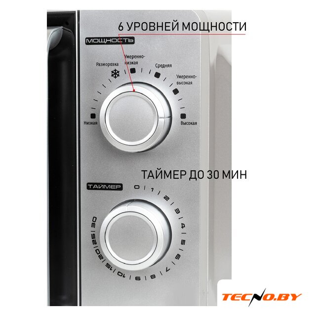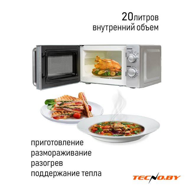 отдельностоящая, микроволны (соло), объем 20 л, выходная мощность микроволн 700 Вт, управление механическое, цвет серебристый