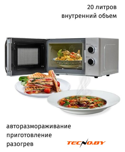 отдельностоящая, микроволны и гриль, объем 20 л, выходная мощность микроволн 700 Вт, управление электронное, автоприготовление, авторазмораживание, цвет серебристый