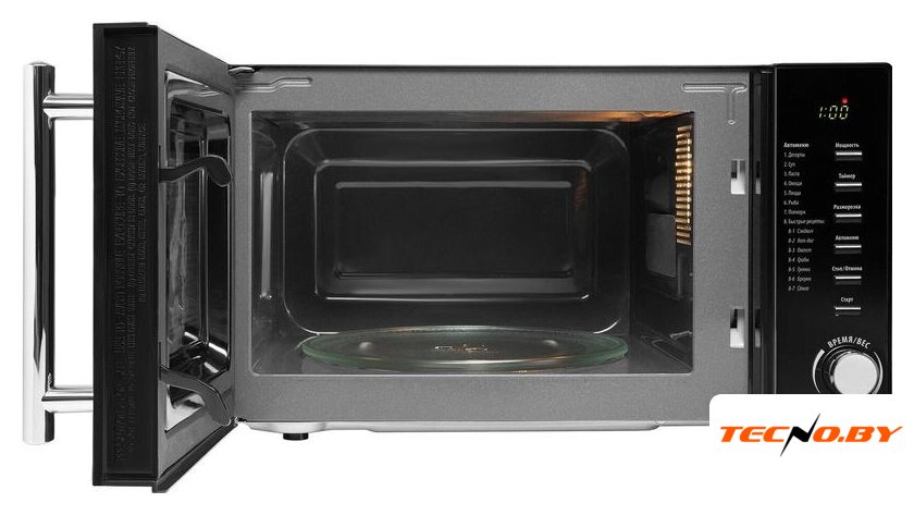 отдельностоящая, микроволны и гриль, объем 25 л, выходная мощность микроволн 900 Вт, управление электронное, автоприготовление, авторазмораживание, цвет черный