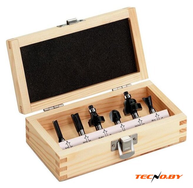 | Комплектация | 4 пазовые фрезы: 8 мм; 12 мм; 1 галтельная фреза: 12,7 мм, R 6,3 мм; 1 зубозакруглительная фреза с шарикоподшипниковой опорой: 21,8 мм; R 6,3 мм; 1 профильная фреза с шарикоподшипниковой опорой: 25 мм; R 4,5 мм; 1 фреза для V-пазов 12,7 мм 14° |