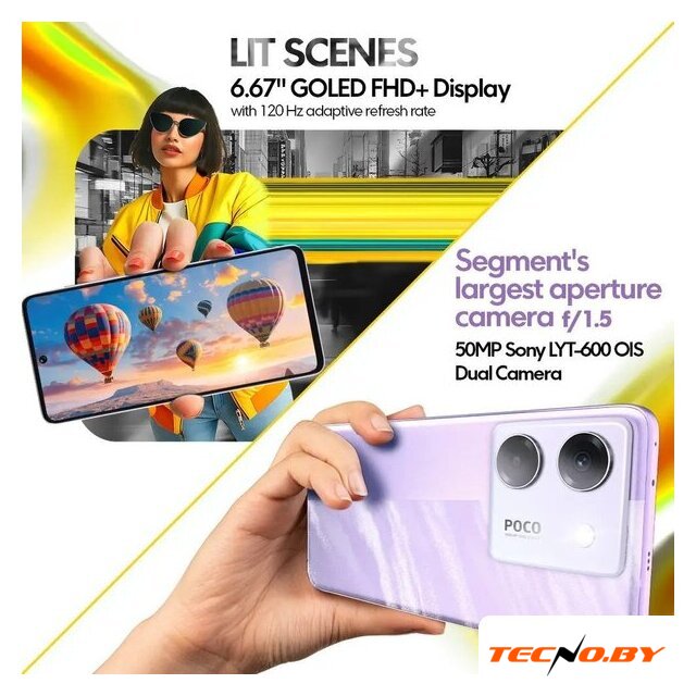 смартфон, Android, экран 6.67" AMOLED (1080x2400) 120 Гц, Mediatek Dimensity 7300, ОЗУ 8 ГБ, память 256 ГБ, поддержка карт памяти, камера 50 Мп, аккумулятор 5000 мАч, моноблок, влагозащита IP52