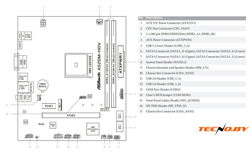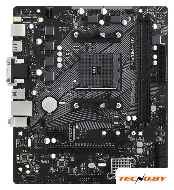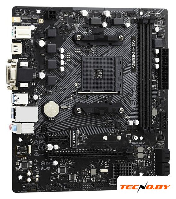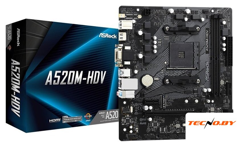 mATX, сокет AMD AM4, чипсет AMD A520, память 2xDDR4 до 3200 МГц, слоты: 1xPCIe x16 3.0, 2xPCIe x1, 1xM.2