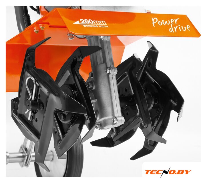 Конструкция мотокультиватора продумана до мелочей: регулируемый по высоте руль позволяет настроить устройство под любой рост пользователя, что обеспечивает дополнительный комфорт при работе. В отличие от более крупных моделей, этот культиватор не имеет надувных колес, что делает его легким и маневренным - его вес составляет всего 16 кг, что позволяет легко перемещать его по участку.