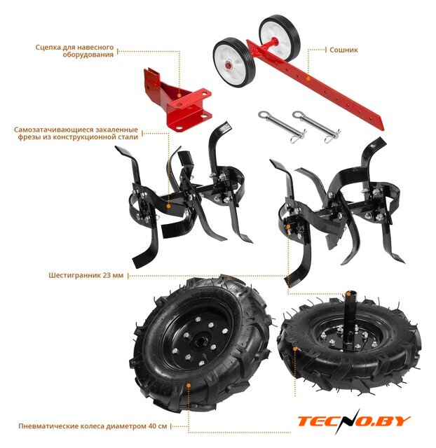 | Комплект поставки | МотоблокФрезы (6 групп по 4 ножа)Колеса 4.00-8Сошник в сборе с транспортировочными колесамиСцепка сошникаМасло трансмисионное, 1 лКомплект крепежаРуководство по эксплуатации |