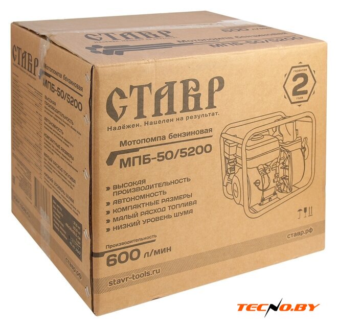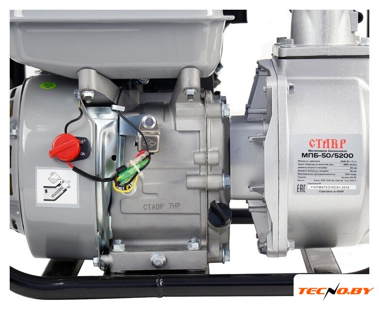 для слабозагрязненной воды, бензиновый двигатель, мощность 4.9 кВт, производительность 700 л/мин, высота подъема 26 м, бак 3.6 л, патрубки 50/50 мм