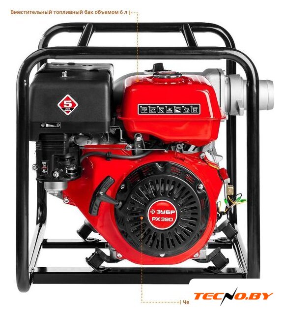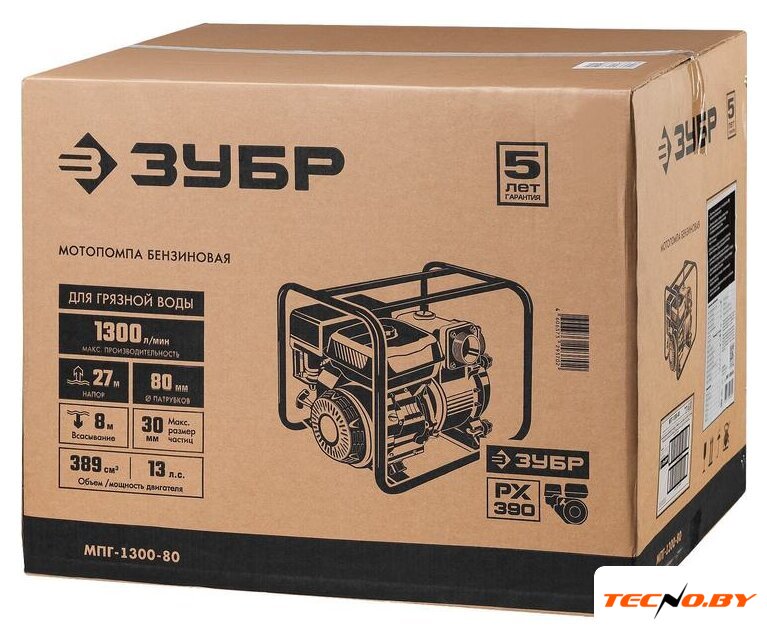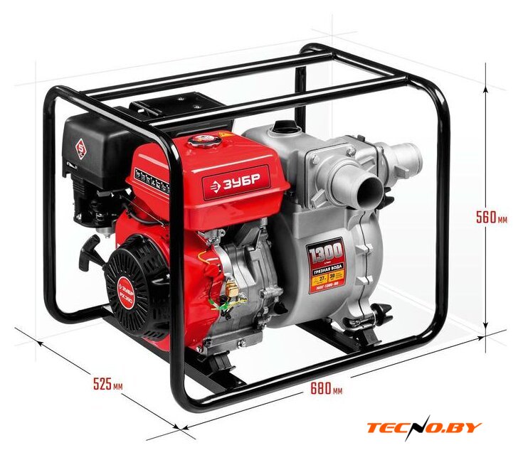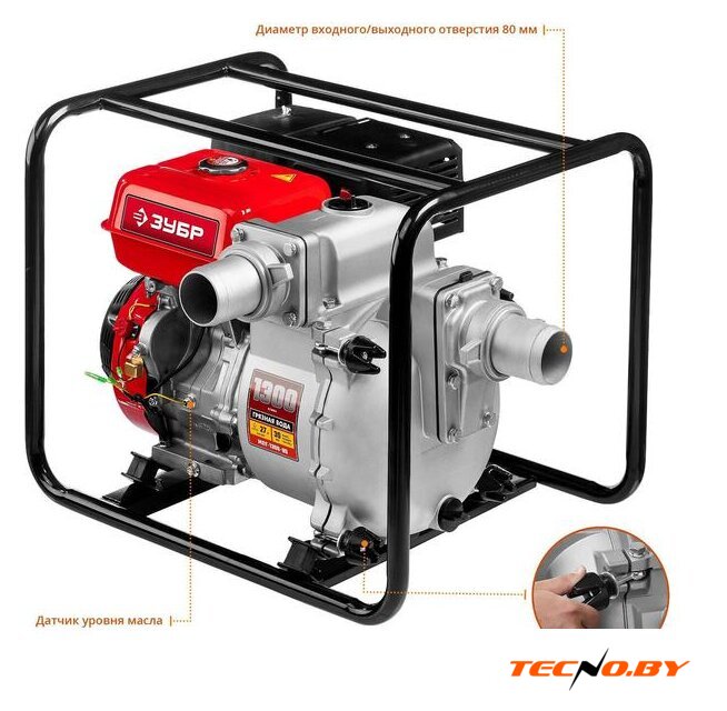 для грязной воды, бензиновый двигатель, мощность 5.1 кВт, производительность 1300 л/ч, высота подъема 26 м, бак 3.6 л, патрубки 80/80 мм