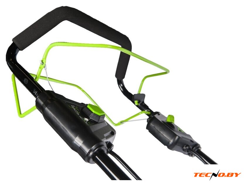 Газонокосилка выполнена в стильном черно-зеленом цвете и обладает прочной конструкцией с металлической декой, что обеспечивает долговечность и надежность устройства. С учетом пластиковых колесных дисков и общего веса в 26,5 кг, она легко перемещается по разным типам рельефа. Уровень шума в 96 дБ делает устройство относительно тихим, что особенно важно для комфортной работы.