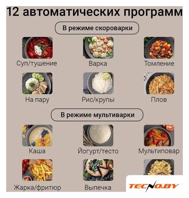 | Перечень режимов работы | На пару, Томление, Каша, Плов, Экспресс, Йогурт/Тесто, Рис/Крупы, Жарка/Фритюр, Выпечка, Суп/Тушение, Варка, Мультиповар |
