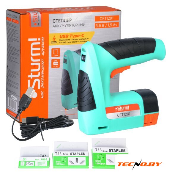 | Комплектация | Аккумуляторный степлер, скобы 6 мм (1000 шт), скобы 8 мм (1000 шт), гвозди 10 мм (500 шт), кабель USB Type-С, инструкция по эксплуатации, инструкция по безопасности |